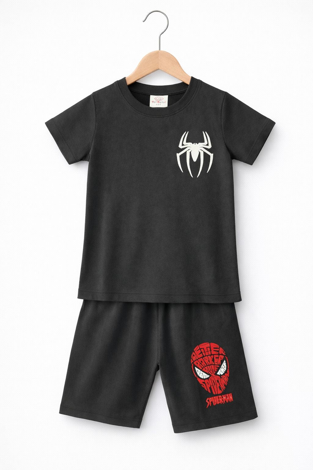 Boys Spider Print Cotton T-Shirt & Shorts Set – Black